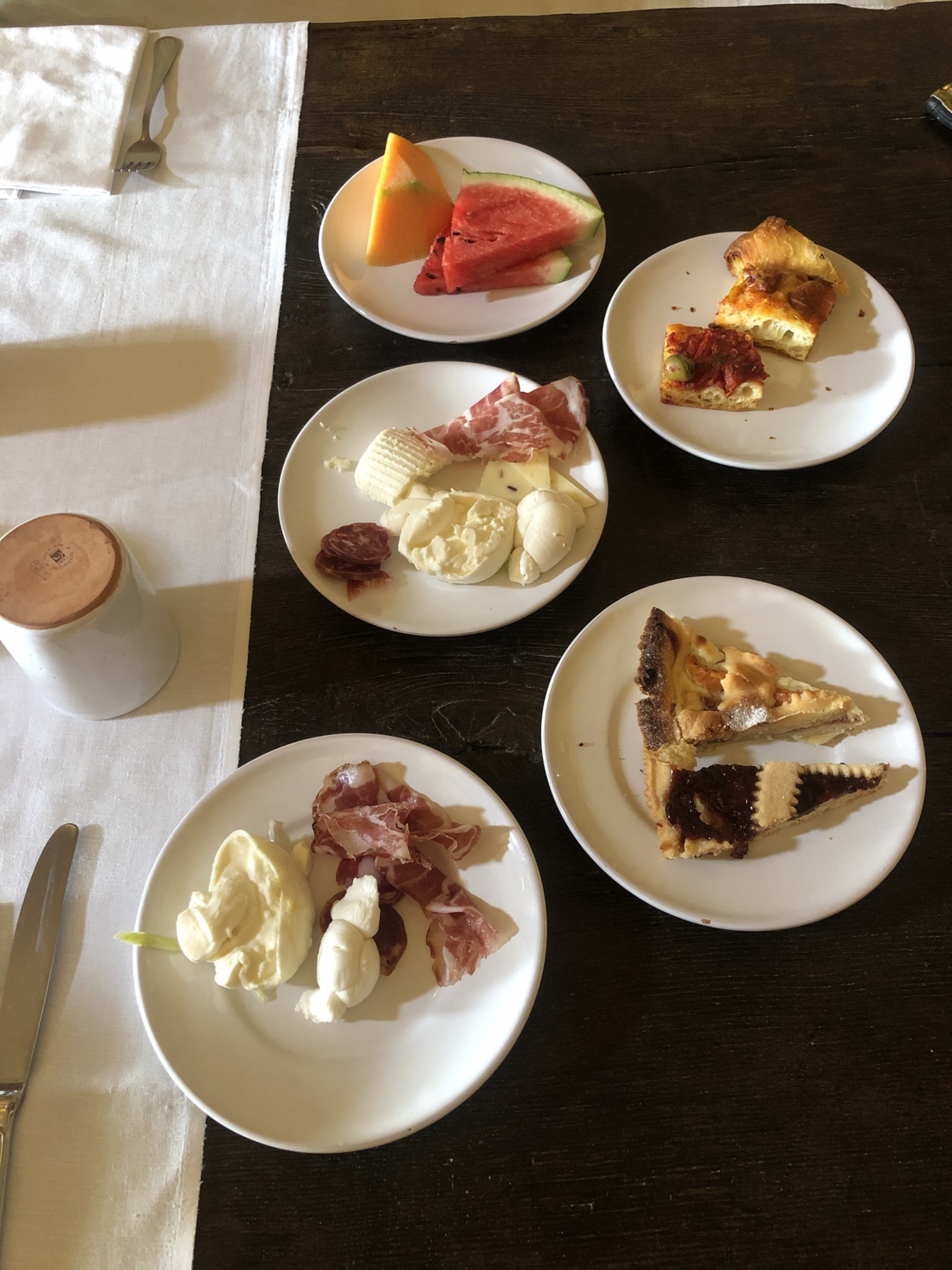 E dopo una lunga serie di salati fra cui spiccano capocollo, mozzarelle, burratine, deliziose focacce con le verdure vi attendono nell'ordine: torta arancia e gocce di cioccolato, plum cake alla cannella, crostata con marmellata, torta pere e gocce di cioccolato, crostata con crema e frutta fresca, crostata di ricotta e albicocche, torta cioccolato e amarene e ciambella al cioccolato, senza contare biscotti e altre amenità.